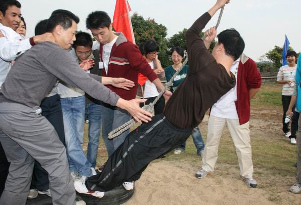 項目介紹:團隊所有成員在規(guī)定的區(qū)域內(nèi)轉(zhuǎn)移到指定的另一區(qū)域.你們在野外探礦時,巖洞出現(xiàn)部分坍塌你們小組逃出但還有人被困。你們小組返回營地取出液體炸藥回去營救中途被一條爬滿鱷魚的河攔住。你們只能用一條繩子過河同時液體炸藥一滴不許漏出四十分鐘后隊友將有生命危險。怎么辦,開動腦筋加油吧