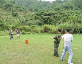 分組團隊在規定的時間內,利用資源(兩根長繩、兩根短繩、兩根短木棒)把一個核彈從一定區域內在不接觸地面的情況下運出來到一安全區域。