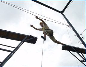 項目名稱:空中斷橋[高空項目] 項目簡介: 兩塊寬30公分的木板,頂端間隔1.2-1.8米,此木板距地面高5米,做項目的學員須自一塊木板越起跨到另一木板上并返回。