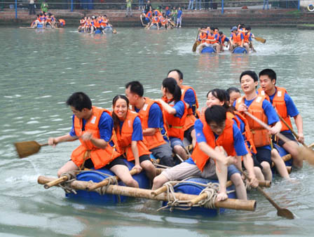 項目簡介:團隊隊員利用有限的資源(油桶若干,竹竿若干,繩子)以最快的速度造成一艘船,搭載本隊隊員在規定的時間內劃過規定水域奪得對岸的目標。 目的意義: 1、 培養領導與分工協作的能力,掌握資源的合理利用與分配。 2、 目標的設定,在明確目標后一個團隊要通過彼此共同的努力才能達到成功的彼岸。 3、 培養一個團體的竟爭能力,培養全體成員同心協力共同戰勝困難的決心與信心。